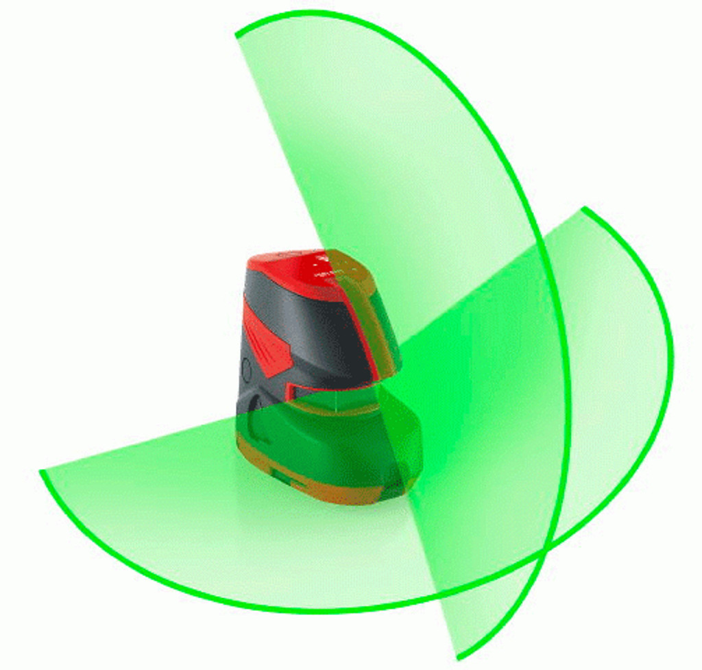 - Den vertikala linjen slår upp i taket en bit bakom lasern och den horisontella linjen sprider till drygt 180°.