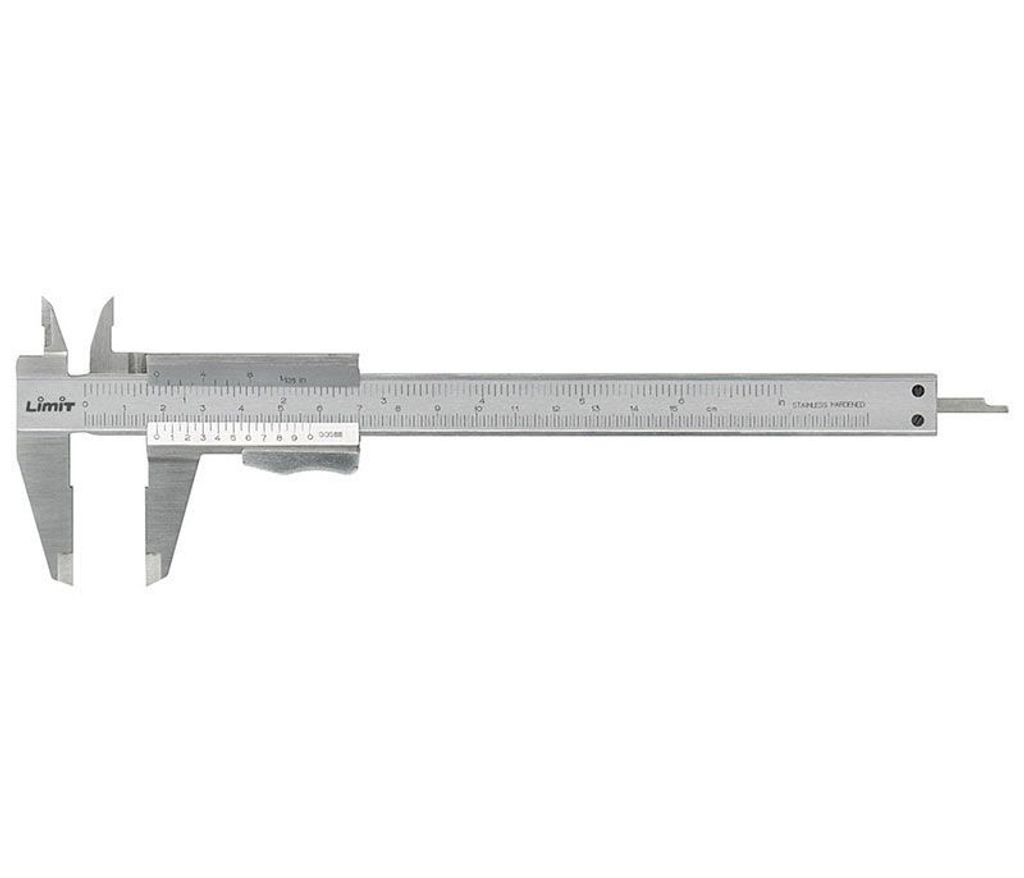 Limit fickskjutmått 4-funktion. Av rostfritt stål. Helt härdat. Mattförkromad skala. Graderad i mm och eng. tum. Nonieskala för 1/128" och 1/20 mm av 39 mm längd. Försett med djupmått och spetsar för invändig mätning. DIN 862.