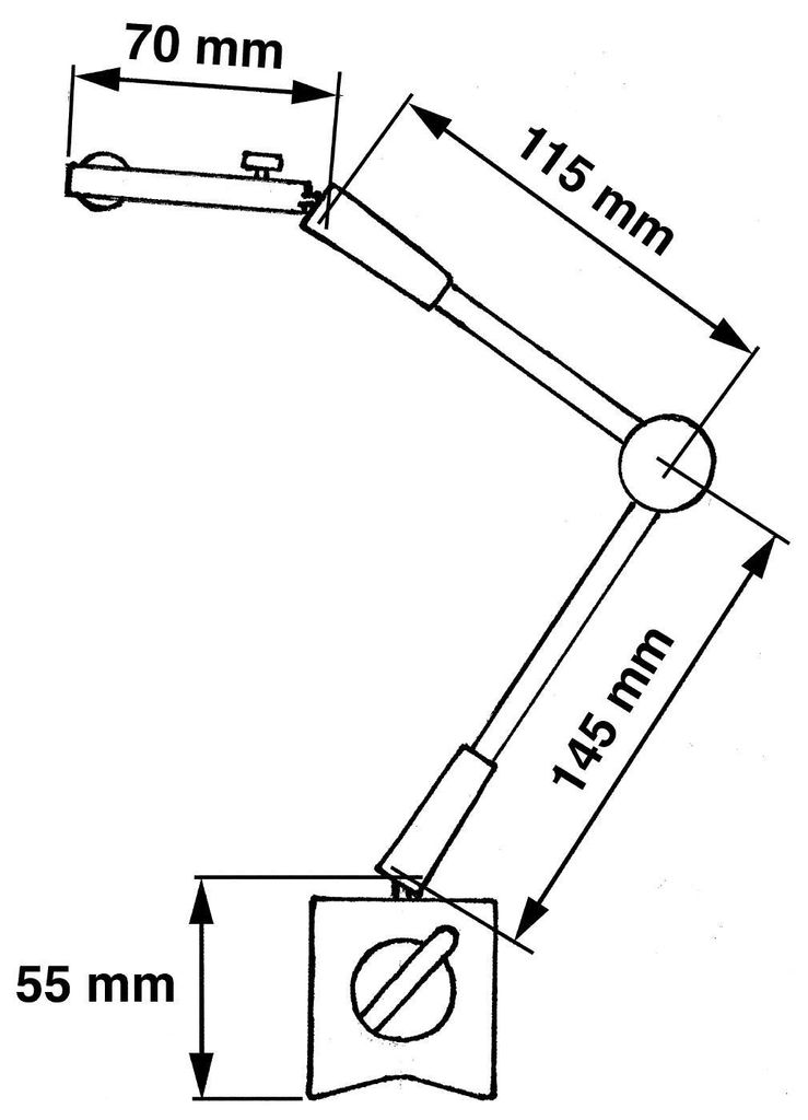 Med fininställning i övre hållare. Hållare med hål för indikatorklocka och laxstjärtspår för vippindikator. Centrallåsning med ett vred för botten-, mitt- och övre led.