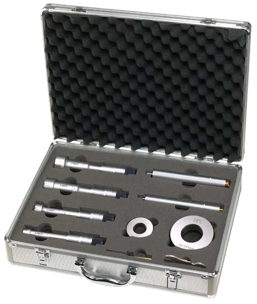 Sats om flera mikrometrar inklusive inställningsringar och förlängningstång. Mikrometrarna har mätytor av hårdmetall.