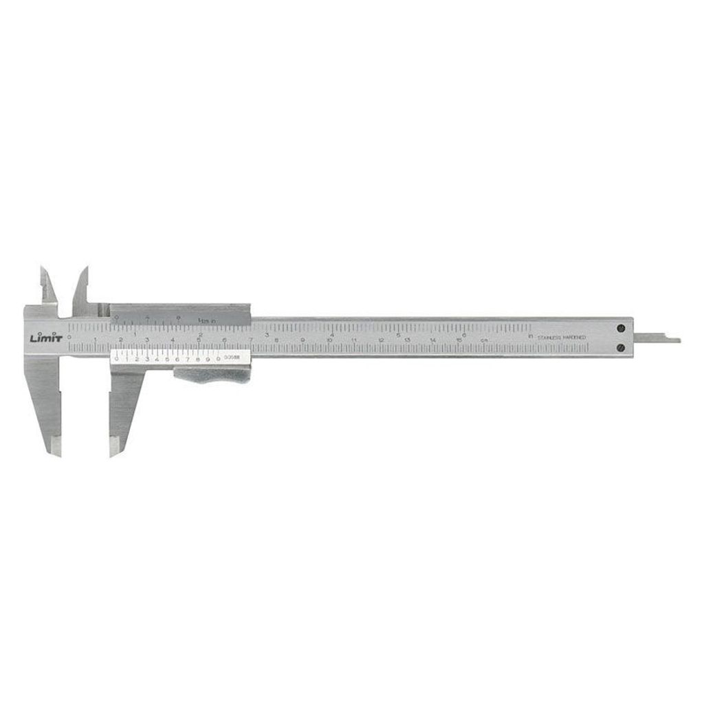 Limit skjutmått 150mm 4-funktion. Skjutmått tillverkad av härdat rostfirtt stål med mattförkromat skala. Skjutmåttet mäter både innediameter, ytterdiameter, höjd och djup. Den är graderad i mm och eng. tum. Nonieskala för 1/128" och 1/20 mm av 39 mm längd. Enligt DIN 862 standard.