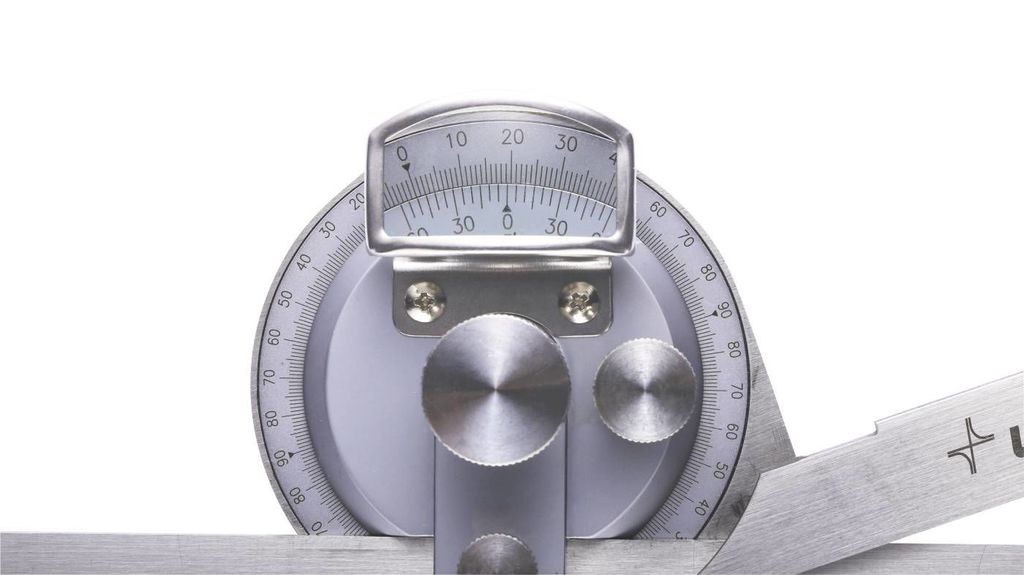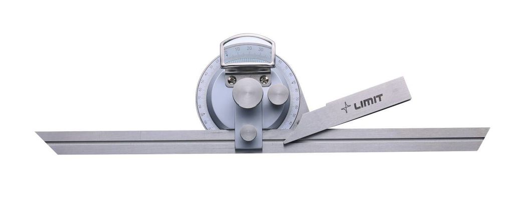 Limit vinkelmätare R-F av rostfritt stål. Gradskivan har hela omkretsen graderad 0-90° i båda riktningarna och kan inställas i önskad vinkel mot anslaget.