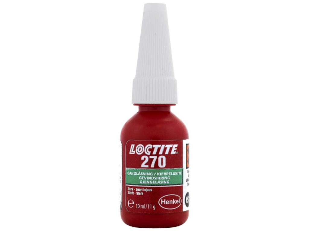 Loctite 270 Gänglåsning. Hög styrka. Framtagen för maximal effektivitet vid fixering och tätning av skruvar, muttrar och pinnskruvar. Möjliggör demontering med handverktyg. Produkten används för permanentlåsning av monteringar där inget får lossna. Den fungerar på alla metaller, inklusive passiva material (t.ex. rostfritt stål, aluminium och pläterade ytor). Tester visar att den är motståndskraftig mot mindre föroreningar av industrioljor, t.ex. maskinoljor, korrosionsskyddsoljor och skärvätskor. Livsmedelsgodkänd enligt P1 NSF reg. nr: 123006. Färg: grön. Max. gängstorlek: upp till M20. Arbetstemperaturintervall: -55°C till +180°C. Kan demonteras genom uppvärmning till 250°C. Lossbrytningsmoment 33 Nm. Fixeringstid; stål: 10 min, mässing: 10 min, rostfritt stål: 150 min. Hanteringsstyrka (vid 22°C) efter 3 tim. Tixotropi: nej. Fluorescens: ja. Viskositet: 400-600 mPa?s.