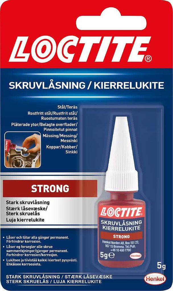 Loctite Skruvlåsning Stark är en höghållfast gänglåsning som permanent säkrar gängade komponenter mot vibrationer och lossning. Produkten tätar även skarvar och förhindrar korrosion, vilket ökar livslängden på mekaniska sammanfogningar. Härdar på 15 minuter och når full styrka efter 3 timmar.