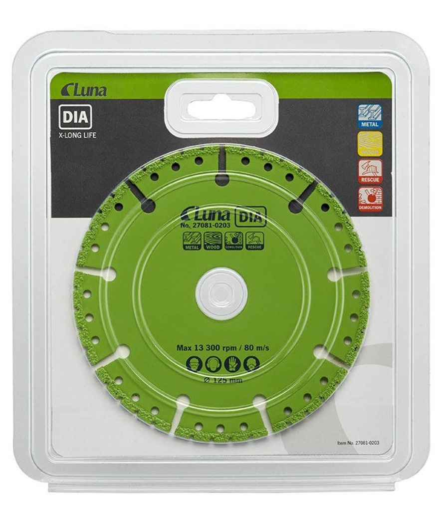 Luna 125mm kapskiva med diamantbelagd kant. Lämplig för kapning av betong, sten, kakel, fibercement, armeringsjärn, plåt, tegel, stål, glasfiber och liknande material utan att behöva byta skiva.