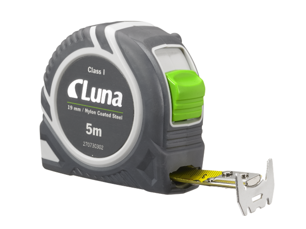 Luna Mätband av mycket hög kvalitet med bromsknapp "Push lock". Kapslat hus i slagtålig och köldbeständig ABS-plas. Har rörlig ändhake med magnet.