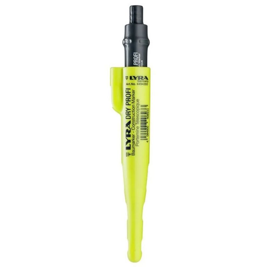 LYRA DRY PROFI med 2,8 mm tjockt grafitstift och extra lång spets, 40mm, för märkning i djupa hål såsom skruvhål i brädor och konsoler. För märkning på de flesta ytor, även oljiga och smutsiga. Djuphålsmärkaren kan även fungera som timmermanspenna