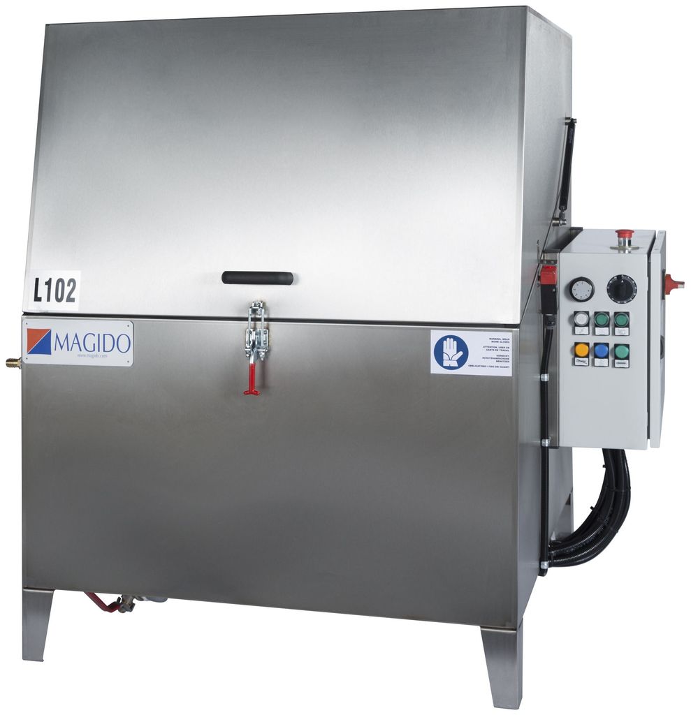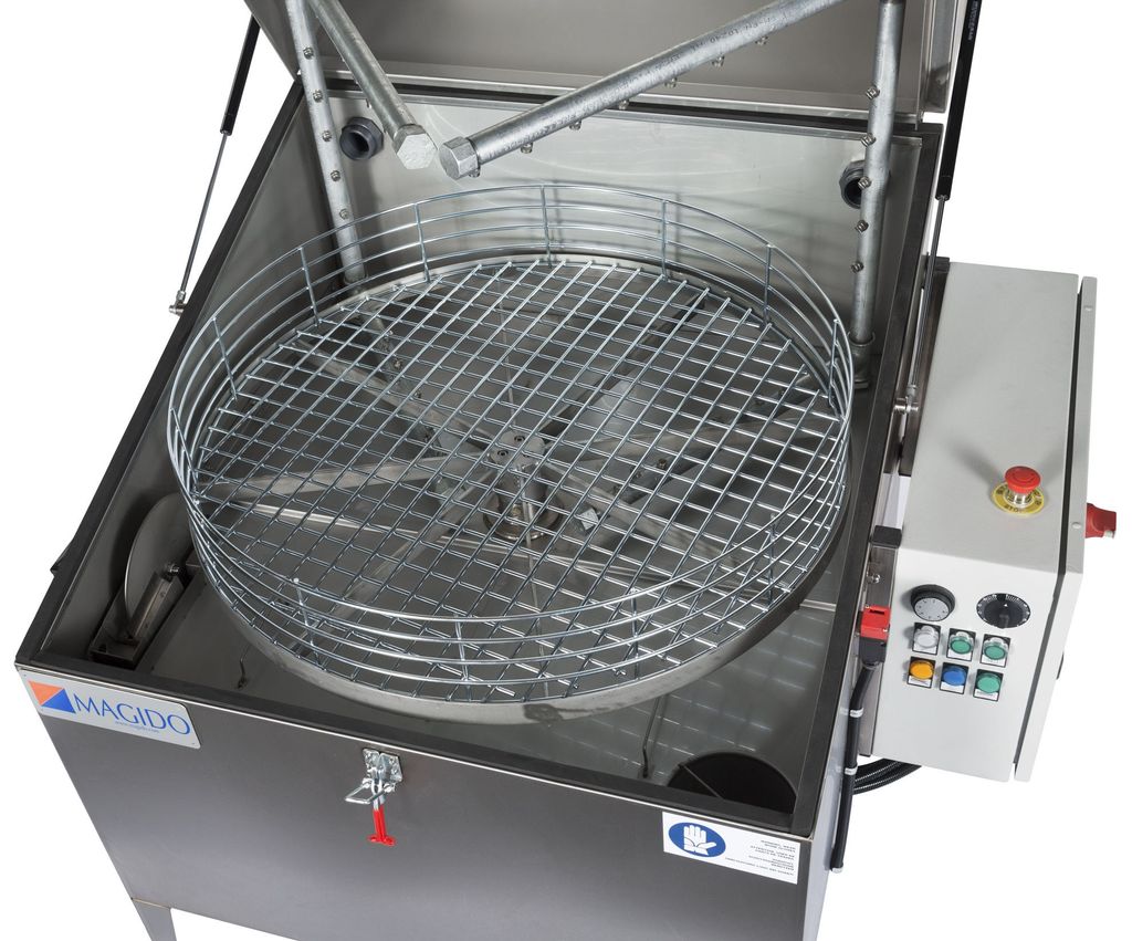 Automatisk smådelstvätt i rostfritt stål med värme. Spolröret med dysor är fast. Godskorgen roterar. L-102/08 har dubbla pumpar och är 3-fas.