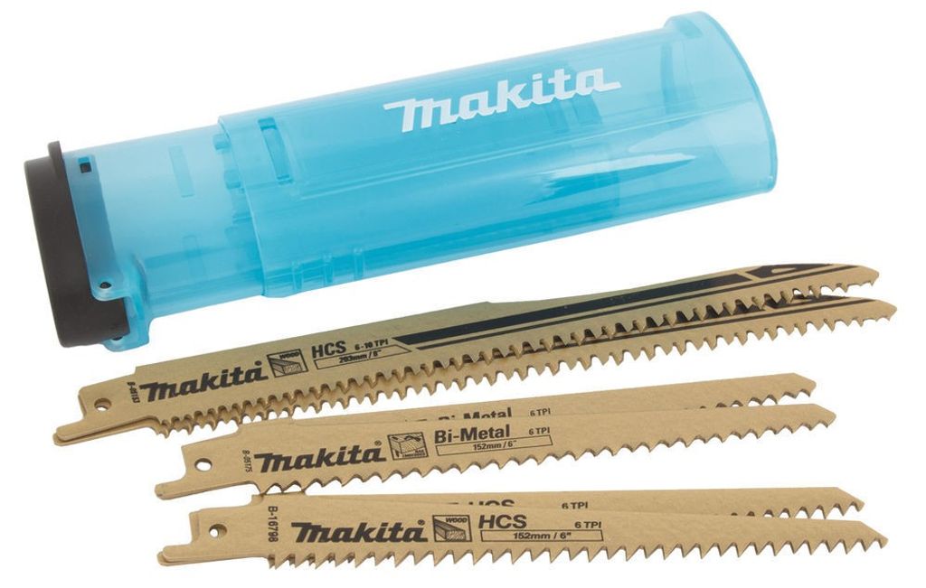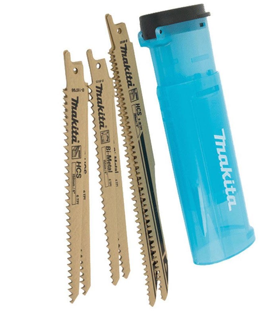 Makita tigersågbladssats med totalt 6 blad för trä: B-05153 snabb kapning av trä (6-10TPI), B-16798 för mjukt trä, spånskivor och plywood (6TPI) och B-05175 för trä med spik i (6TPI).