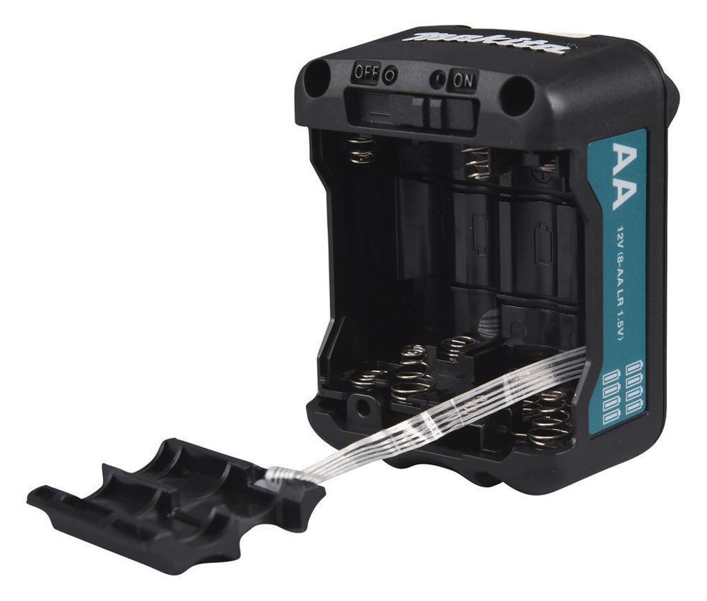 Makita Batteriadapter CXT möjliggör användning av 8xAA-batterier för att driva SK700-lasrar. Denna adapter är designad för att ge en batterilivslängd som motsvarar ett 2,0 Ah CXT-batteri (BL1021B), vilket gör det enkelt att använda lasern när Li-ion-batterier inte är tillgängliga.