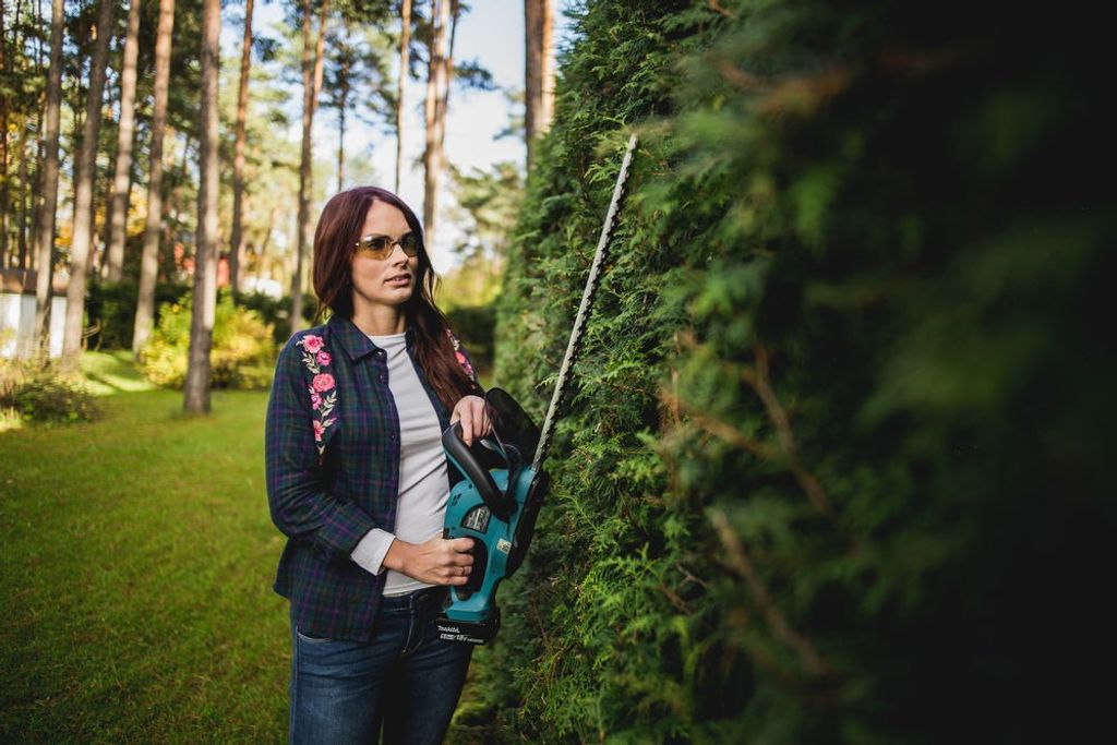 Makita DUH523Z är en sladdlös, tyst och miljövänlig 18V häcksax med ergonomisk konstruktion. Svärdlängd 520 mm och 15 mm skärkapacitet. Tänder på båda sidorna av bladet.