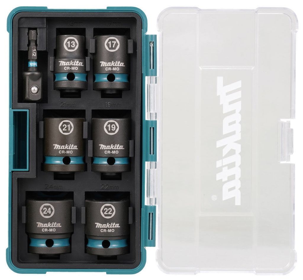 Utrusta dig med Makita E-16592, ett 7-delars set med Krafthylsor Impact BLACK, inklusive övergång från 1/4" till 1/2". Designade för hård industriell användning.