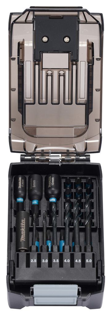 E-22850 från Makita samlar dina mest använda tillbehör i ett robust och lättöverskådligt set. Den batteriformade förvaringen tar minimalt med plats i väskan och klickar smidigt i hyllor och lådor. Sortimentet täcker vardagens skruv och borrjobb med korta och långa bits för god åtkomst samt HSS metallborrar med hexfäste som passar direkt i snabbchuck eller bitshållare.