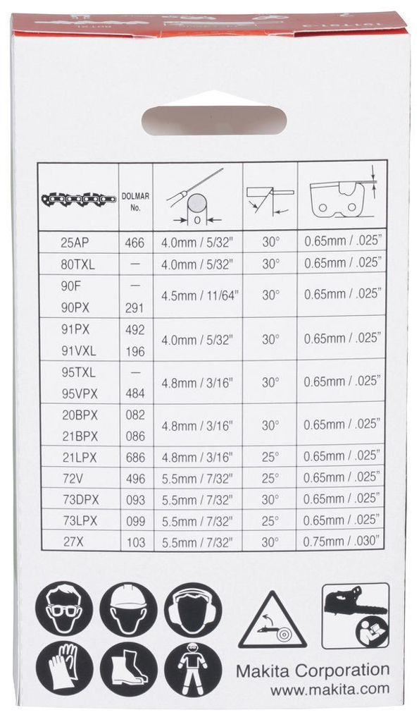 Makita Sågkedja 59L är kompatibel med Makitas 14" svärd och är lätt att installera. Fildiametern för slipning är 4,0 mm, vilket gör det enkelt att underhålla och hålla kedjan i toppskick för optimal prestanda.