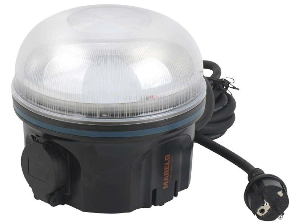 Mareld Arbetslampa Shine 2500 (2500umen). Mareld Funktionell klotlampa LED, utformad för att ge ett spridande allmänljus. Kan även hängas upp tack vare krok i botten. Lampan är stöttålig och utrustad med extra eluttag.