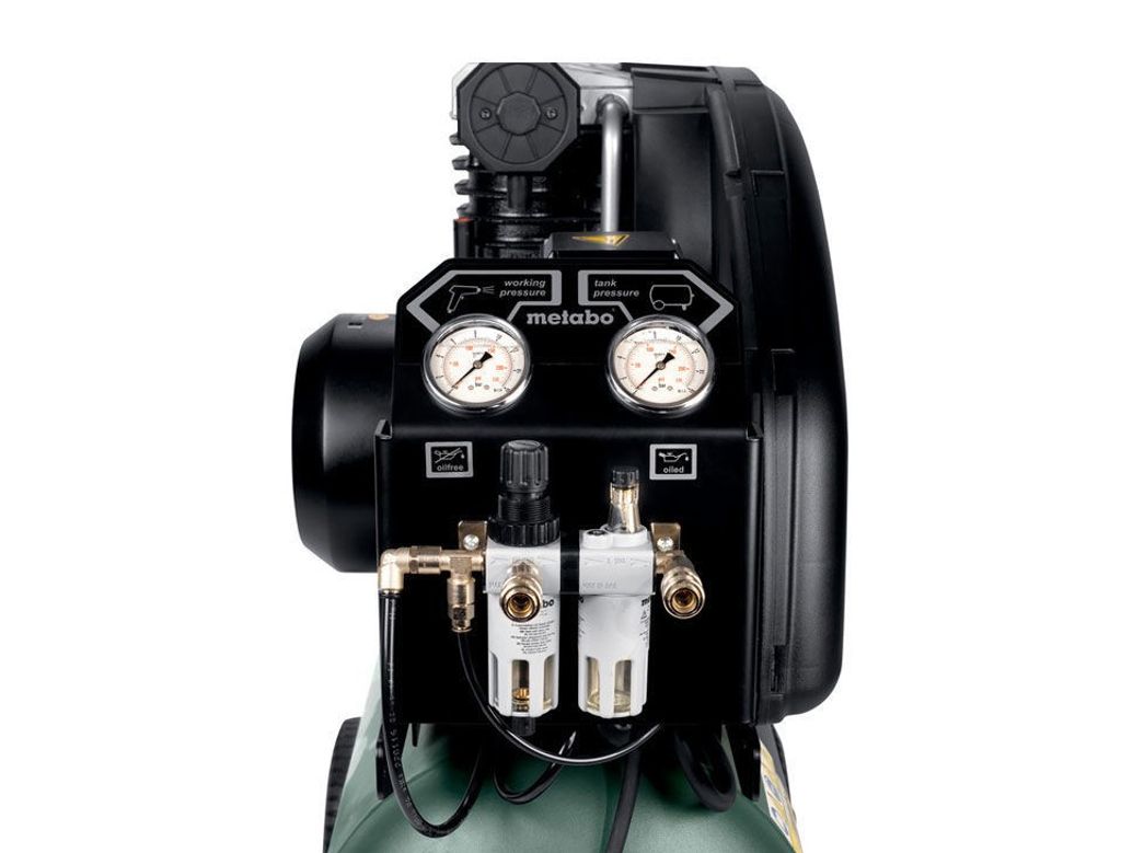 Kompressorn är anpassad för trefasström, vilket ger den extra kraft när det behövs. Arbetstrycket kan justeras för att passa olika arbetsuppgifter, och luftkvaliteten förbättras av filtertrycksbegränsaren med manometer och dimsmörjare.