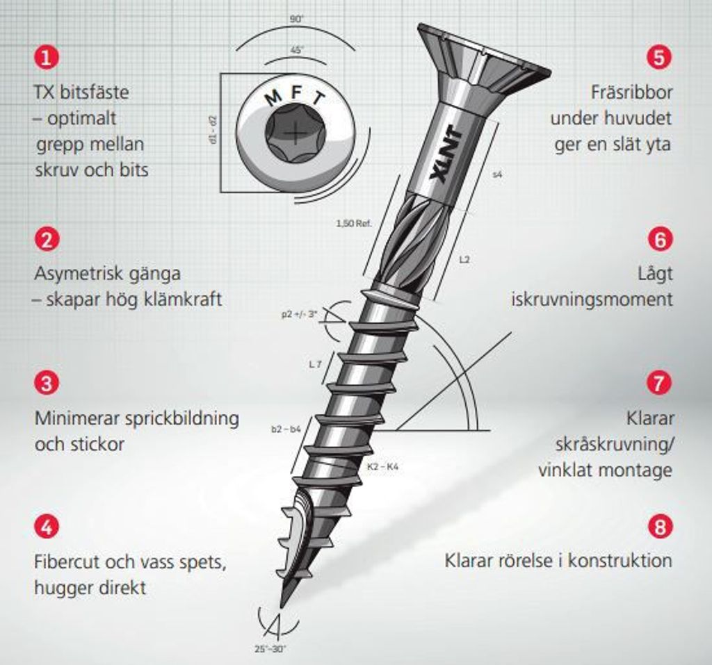 MFT Träskruv XLNT är tillverkad av härdat kolstål SAE 10B21 och är utformad med en rad unika egenskaper för att garantera en enkel och säker montering. Skruven har genomgått en MFT 2000 C4 typgodkänd ytbehandling, vilket gör den idealisk för krävande förhållanden och ger den en korrosivitetsklass C4. Den har ett fiberskär i spetsen och en extra fräsgänga på skruvstammen, vilket minimerar risk för sprickbildning och ger ett lågt iskruvningsmoment. Dessutom har skruven fräsribbor under huvudet som försänker skruven och ger en slät yta utan stickor. TX bitsfäste garanterar optimalt grepp mellan skruv och bits. Den är delgängad och passar för både inomhus och utomhus användning.