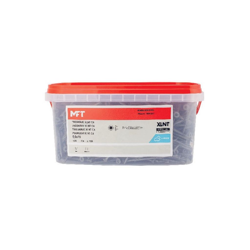 MFT Träskruv XLNT är en högkvalitativ skruv tillverkad av härdat kolstål SAE 10B21, speciellt utformad för att minimera sprickbildning och iskruvningsmoment. Den har en MFT 2000 C4 typgodkänd ytbehandling och faller under korrosivitetsklass C4. Skruven kommer med ett fiberskär i spetsen, extra fräsgänga på stammen och fräsribbor under huvudet. Även lämplig för inomhus och utomhus användning.