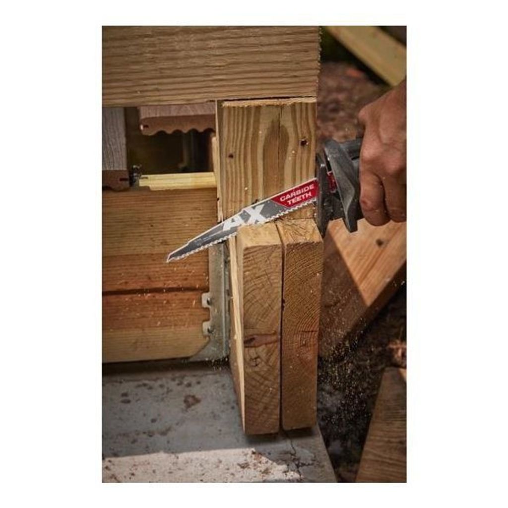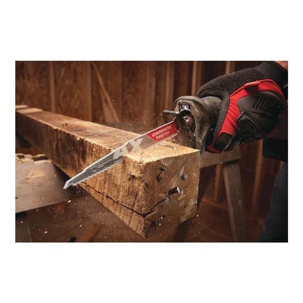 Milwaukees AX tigersågblad med karbidtänder är konstruerat för att leverera lång livslängd i de tuffast applikationerna samtidigt som det är ett av de snabbaste sågbladen på marknaden. AX-bladet har en optimerad hårdmetallteknik som ger extremt lång livslängd och en aggresiv 5 TPI-bladdesign som möjliggör snabb sågning i trä och trä med spik.