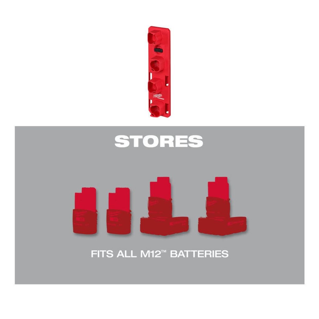 - Milwaukees M12 batterihållare i Packout system är en mångsidig lösning för att förvara upp till 4 batterier. Med sin klick- och låsmekanism ger den en säker förvaring och snabb tillgång till batterierna. Den är del av PACKOUT™ förvaringssystemet och kan skräddarsys för dina behov.