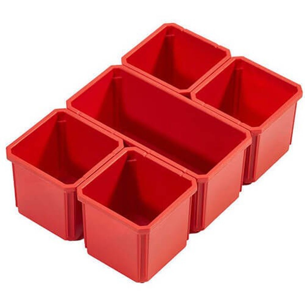 Setet består av en stor låda och fyra mindre, perfekt balanserat för allt från skruv och plugg till bits, kopplingar och elkomponenter. Den större lådan rymmer bulkartiklar eller större beslag medan de mindre ger finfördelad struktur. Insatserna kan kombineras och flyttas om efter jobbet för dagen så att du alltid har rätt innehåll nära till hands.