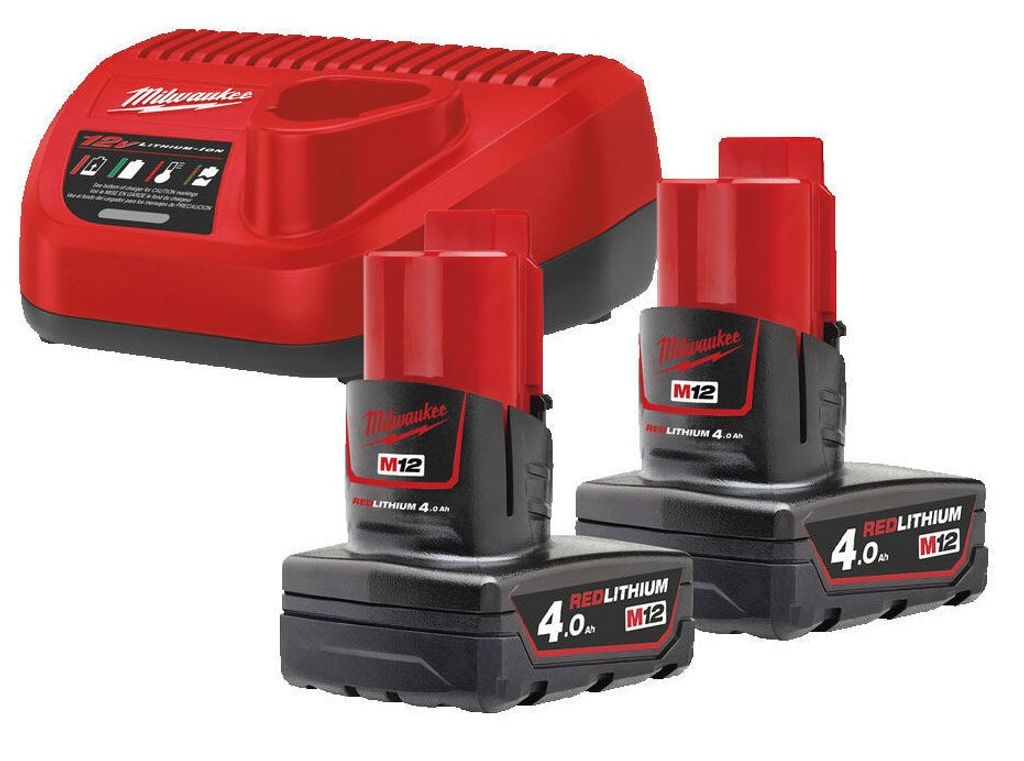 Milwaukee M12 NRG-402 är ett batteri och laddpaket bestående av 2st M12 B4 4,0ah batterier samt batteriladdare C12C för M12 batterier.