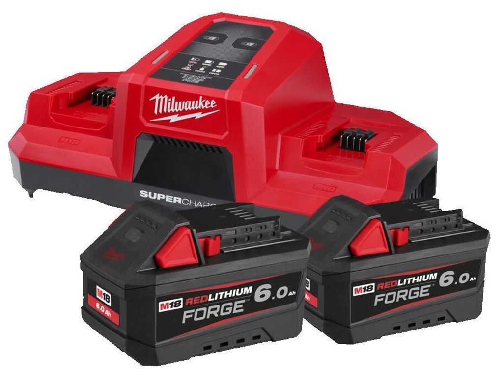 Milwaukee M18 FORGE™ batteri- och laddningskit är designat för maximal prestanda och effektivitet. M18 FORGE™ 12,0 Ah-batteriet ger upp till 50 % mer kraft än tidigare generationer och laddas till 80 % på endast 35 minuter med den medföljande M18™ dubbel superladdaren.