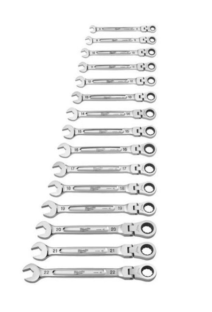 Milwaukee MAX BITE™ spärrnyckelsats i 15 delar med 180° vridbart huvud för bättre åtkomst i trånga utrymmen. MAX BITE™ öppet grepp minskar avrundning och strippning.
