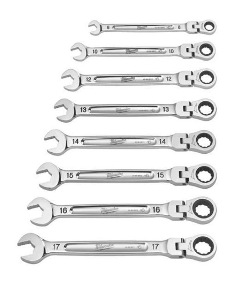 Milwaukee MAX BITE™ spärrnyckelsats i sju delar med 180° vridbart huvud för bättre åtkomst i trånga utrymmen. MAX BITE™ öppet grepp minskar avrundning och strippning.