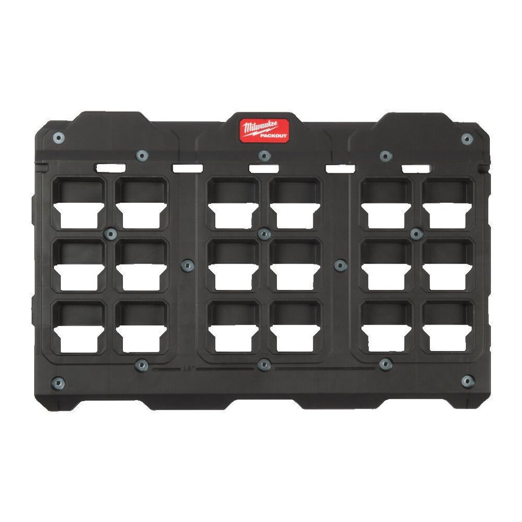 Med denna lite större monteringsplatta till Milwaukees Packout system kan du enkelt förvara dina produkter i Milwaukees Packout-serie. Snabbjusteringsflikar möjliggör enkel montering.