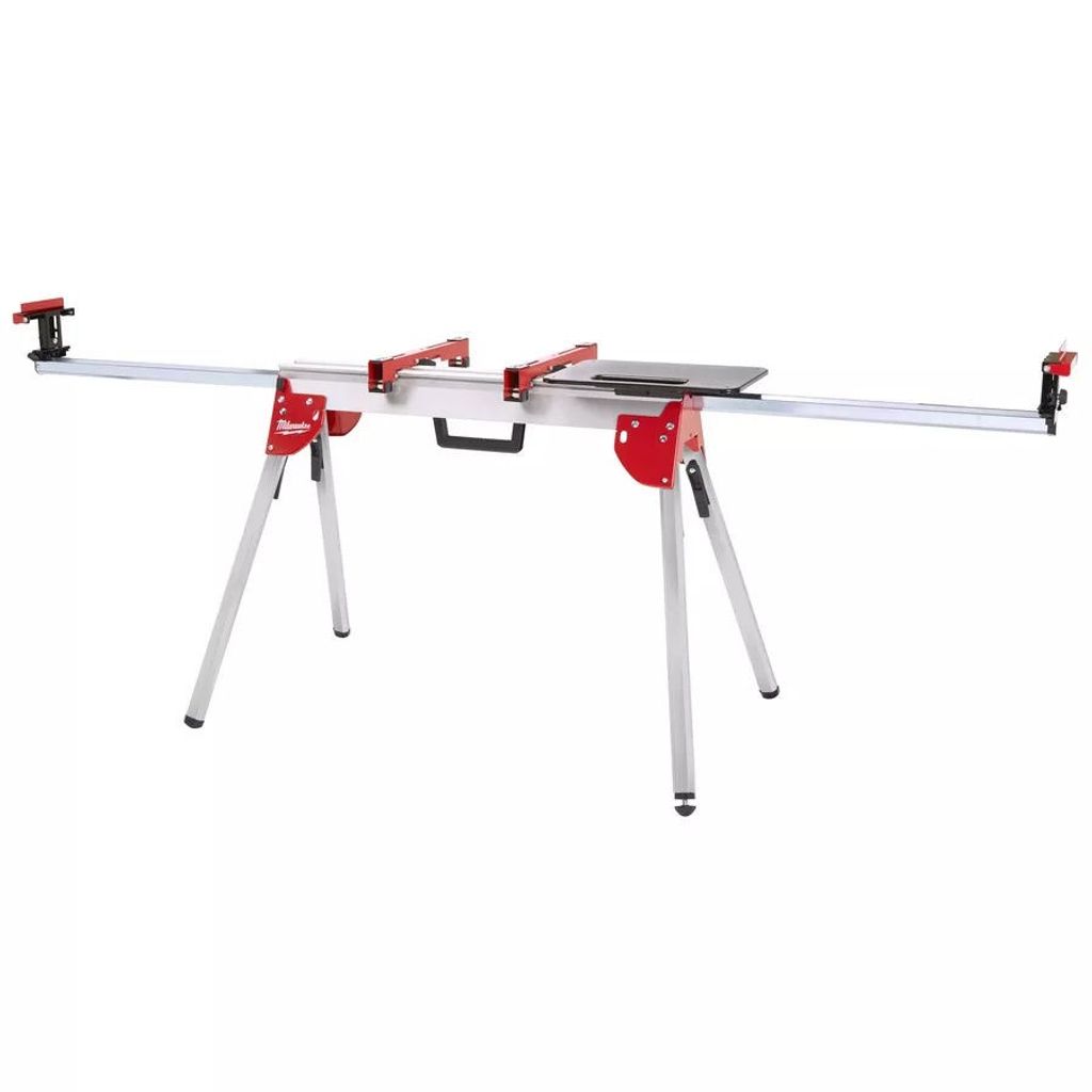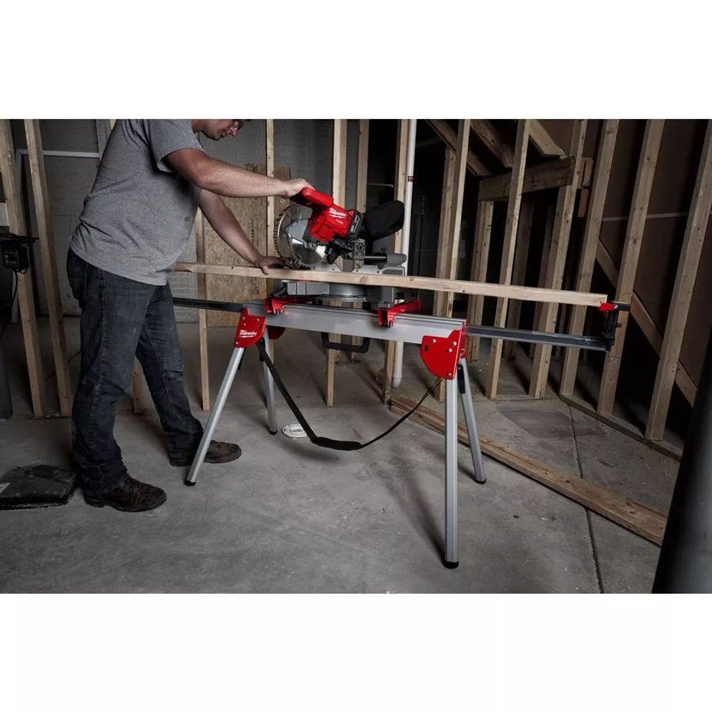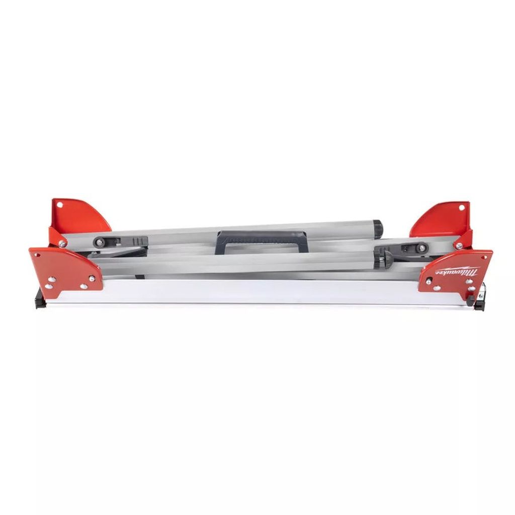 Milwaukee MSL 2000 är ett Universalbord till kap-/gersåg. Lättviktskonstruktion i aluminium, enkel att transportera på arbetsplatsen. Endast 1,09 m, får arbetsbordet plats i de flesta bilar. Förlängningsbar i båda ändarna, totallängd i utfällt läge är 2,54 m. Klarar upp till 227 kg. Smidig höjdjustering av benen, behöver bara justera på ett ställe för snabb uppställning på ojämna underlag. Snabbfästen. Fasta stopp på benen för snabb höjdjustering. Kompakt och hopfällbar design med snabbfästen. Höjd 860 mm. Vikt 14 kg. Levereras med ett par (2st) monteringsbyglar.