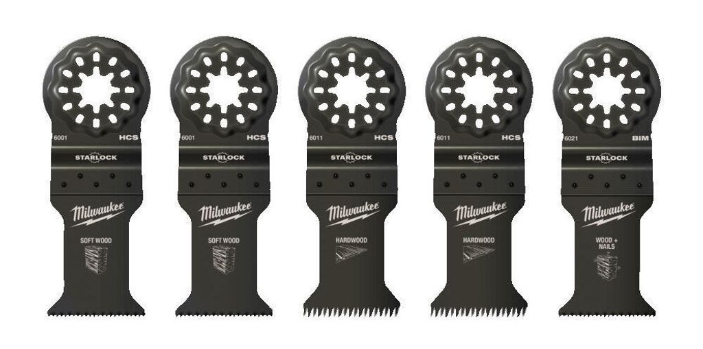 Antal blad 5 st (2 x standardblad för trä, 2 x 3-skärs tandgeometri för hårt och mjukt trä, 1 x bi-metallblad för trä med spikar)