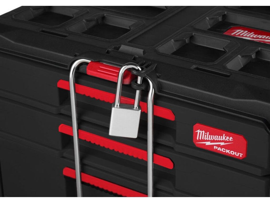 Den innovativa säkerhetsbygeln på lådorna förhindrar oönskad öppning under transport, medan möjligheten att låsa lådorna med hänglås ger extra säkerhet. Tillverkad av slagtålig polymer, är detta lådset byggt för att tåla de tuffaste arbetsförhållandena och är en del av Milwaukee's PACKOUT™ förvaringssystem, vilket garanterar kompatibilitet och flexibilitet i din verktygsförvaring. Den totala lastkapaciteten på upp till 22 kg gör detta set till en kraftfull lösning för alla dina förvaringsbehov.