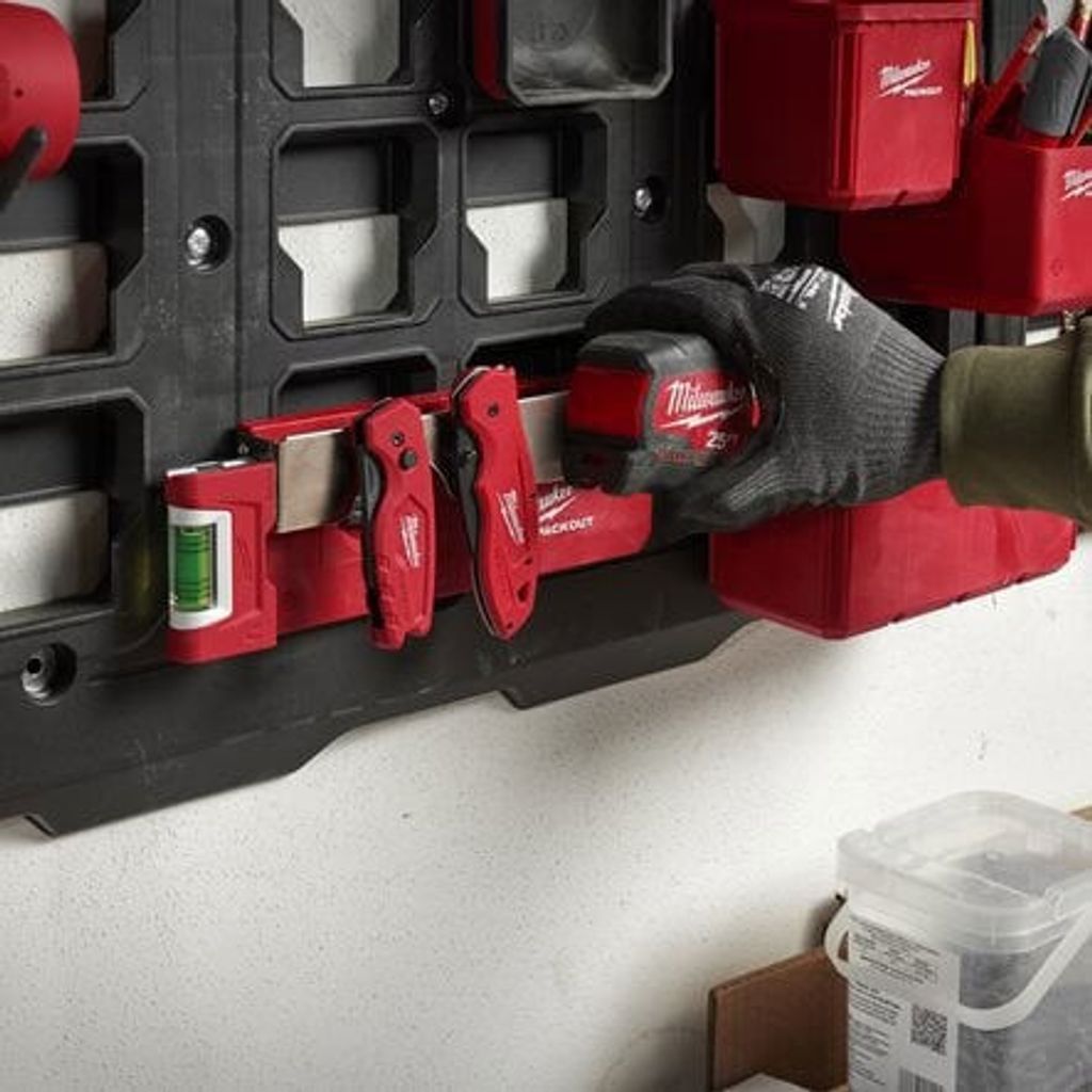 Milwaukee PACKOUT™ upphängningsskena för bältesklämmor är idealisk för att hålla verktyg och tillbehör organiserade och lättillgängliga. Perfekt för användning på byggarbetsplatser, verkstäder och garaget, och ger en flexibel lösning för förvaring inom PACKOUT™-systemet.