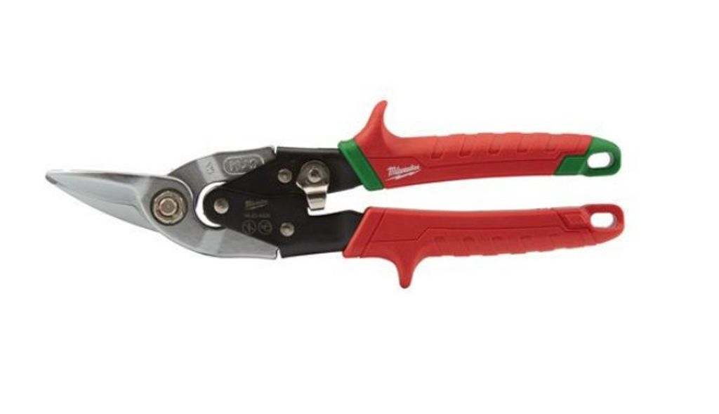 Milwaukee plåtsax för korta och svängda snitt. Specialdesignade platser för tummen och pekfingret för ökad komfort och mindre trötthet. Räfflade skär förhindrar glidning vid klippning.