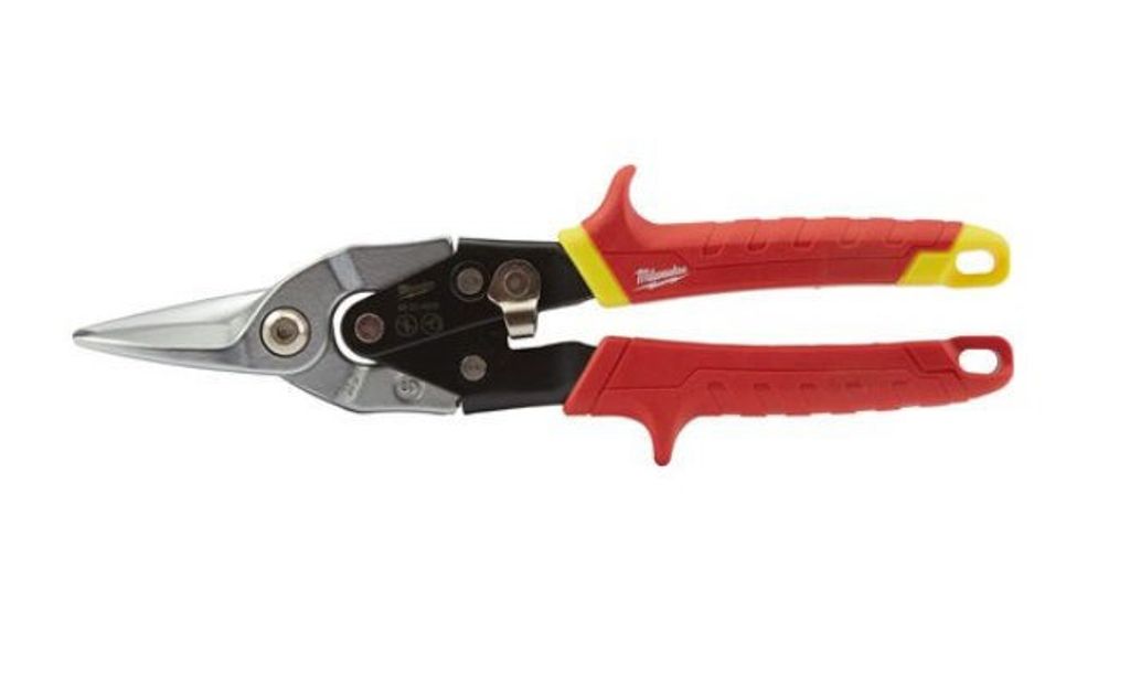 Milwaukee plåtsax för korta och svängda snitt. Specialdesignade platser för tummen och pekfingret för ökad komfort och mindre trötthet. Räfflade skär förhindrar glidning vid klippning.