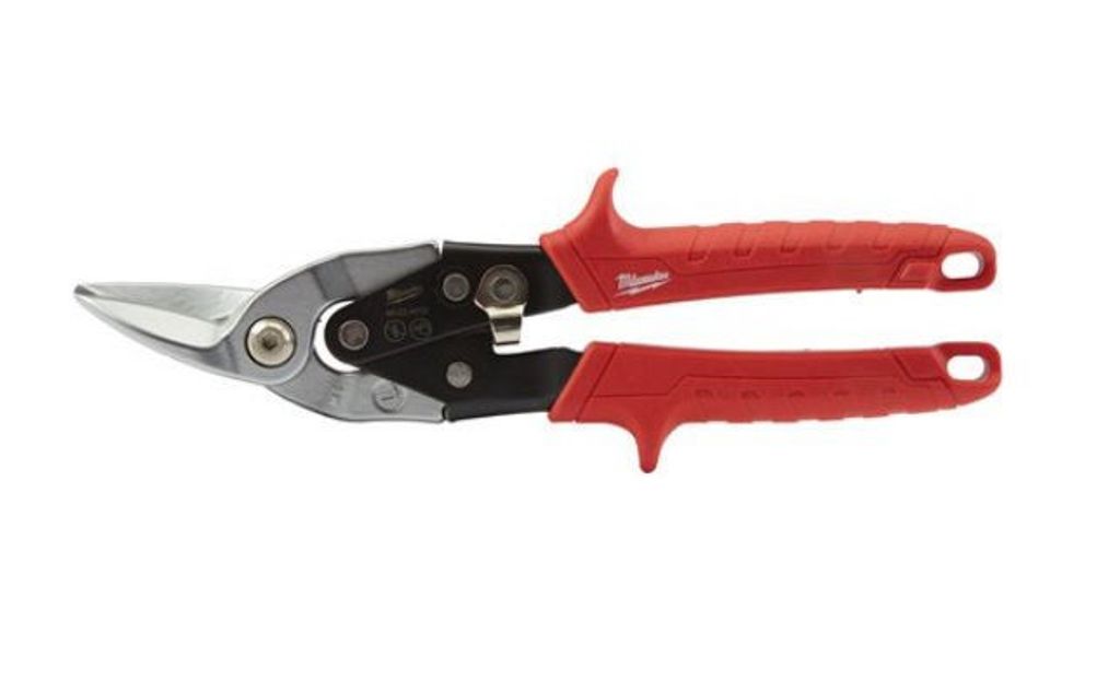 Milwaukee plåtsax för korta och svängda snitt. Specialdesignade platser för tummen och pekfingret för ökad komfort och mindre trötthet. Räfflade skär förhindrar glidning vid klippning.