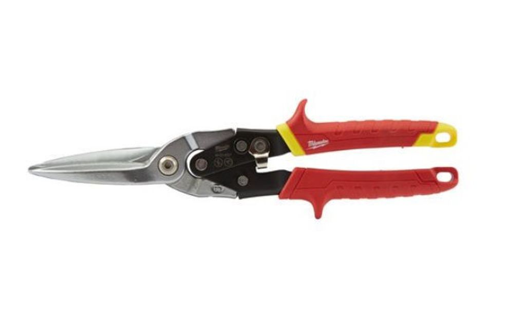Milwaukee plåtsax för korta och svängda snitt. Specialdesignade platser för tummen och pekfingret för ökad komfort och mindre trötthet. Räfflade skär förhindrar glidning vid klippning.