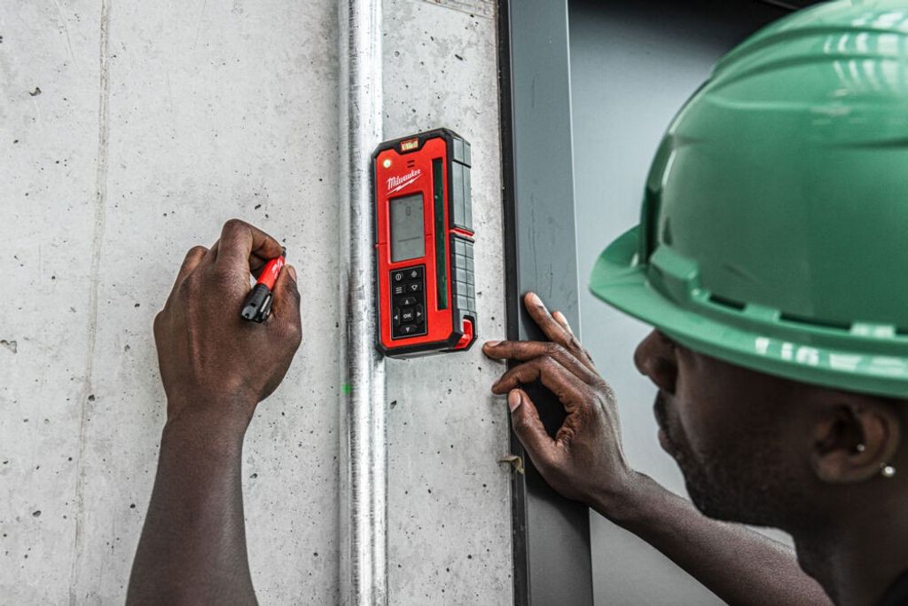 Milwaukee RD300G har justerbar maskering för att förhindra reflektioner från fönster, och de integrerade magneterna gör att mottagaren enkelt kan fästas på metallytor. Ett 120 mm mottagningsområde optimerar avläsningen, och den justerbara mittlinjen möjliggör mer effektiv lasermontering.