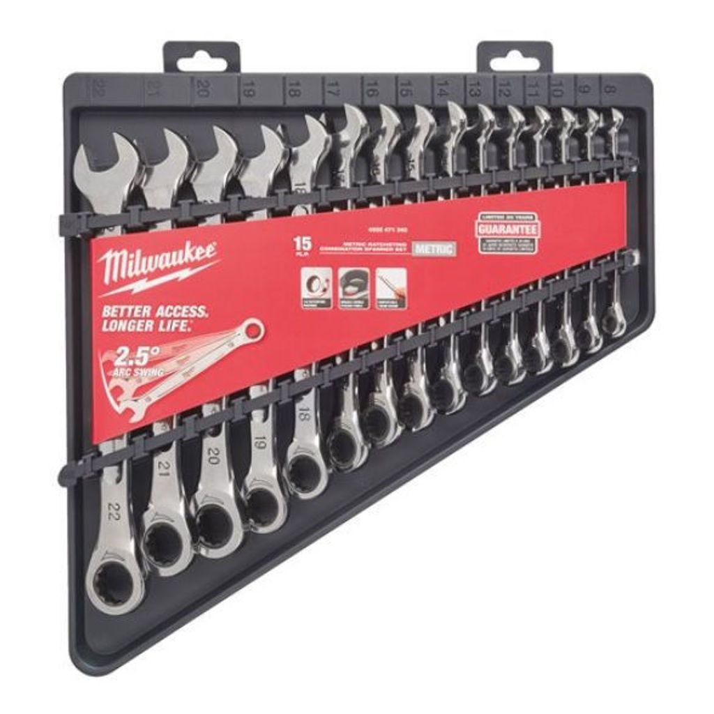 Milwaukee spärrnyckelsats; 144 spärrtänder för lättare åtkomst. Hållbara dubbelstaplade spärrhakar för längre livslängd. Rundade ergonomiska handtag.
