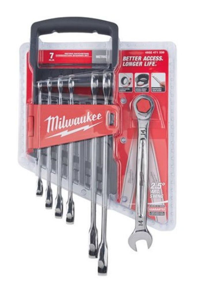 Milwaukee spärrnyckelsats; 144 spärrtänder för lättare åtkomst. Hållbara dubbelstaplade spärrhakar för längre livslängd. Rundade ergonomiska handtag.