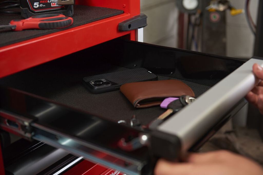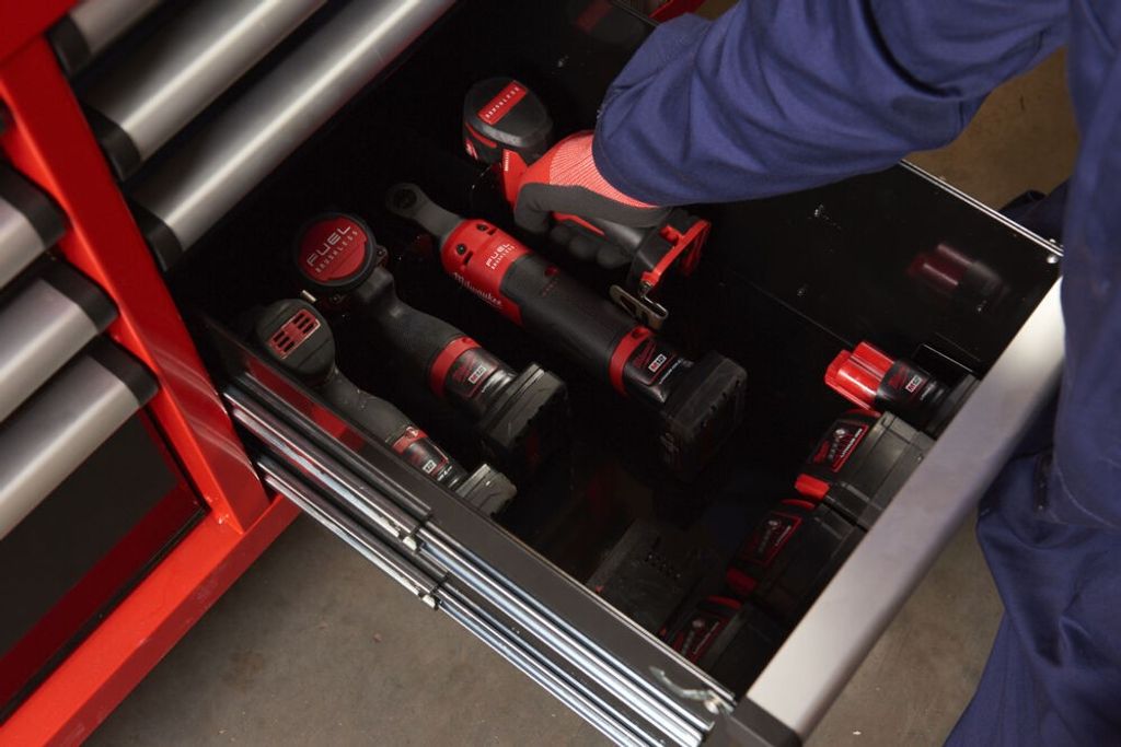 Milwaukee stor verktygsvagn med 10st utdragbara lådor. Verktygsskåpet har hög lastkapacitet, halkskyddsmatta, eluttag direkt i skåpet och robusta industrihjul.