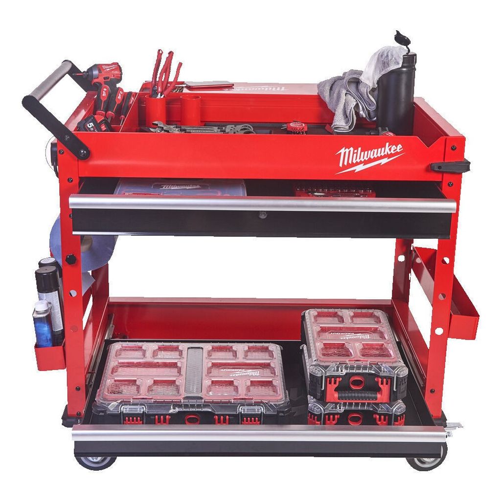 Milwaukee SWC40-1 arbetsvagn på industrihjul. Verktygsvagnen har inbyggda förvaringsfack, utfällbar bakre hylla, eluttag och 2st flyttbara hyllor.