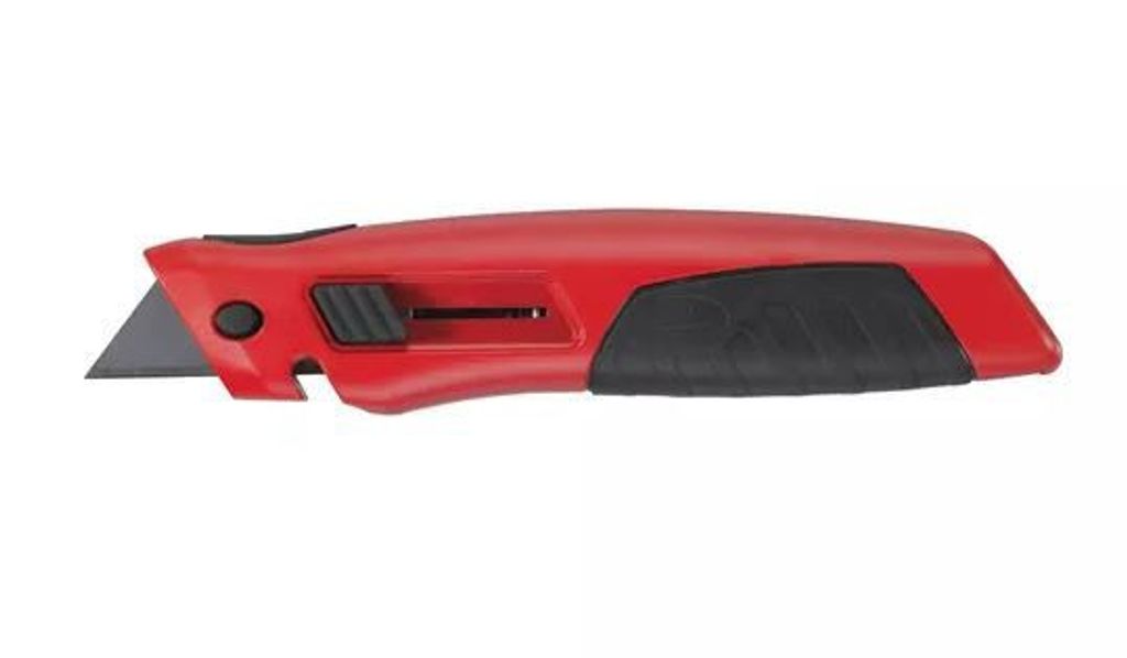 Milwaukee Universalkniv med inbyggd kabelskalare. Knappen för att skjuta ut knivbladet sitter på sidan för att förhindra att man oavsiktligt skjuter fram bladet.