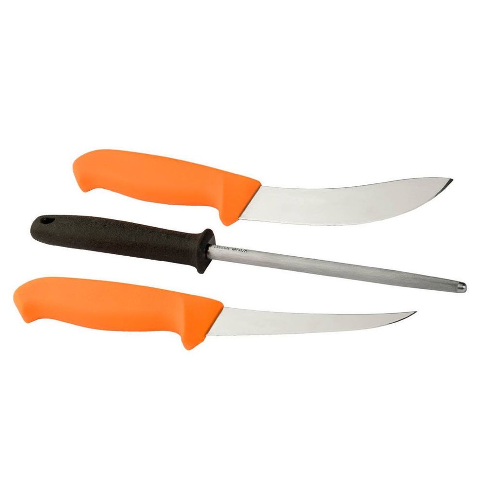 Jaktset som innehåller en flåkniv, en styckkniv och ett skärpstål. Förvaras i praktisk, sticksäker förpackning. Knivarna har ergonomiskt utformade skaft med mönstrat friktionsgrepp och fingerskydd vilket gör dem både säkra och behagliga att arbeta med.