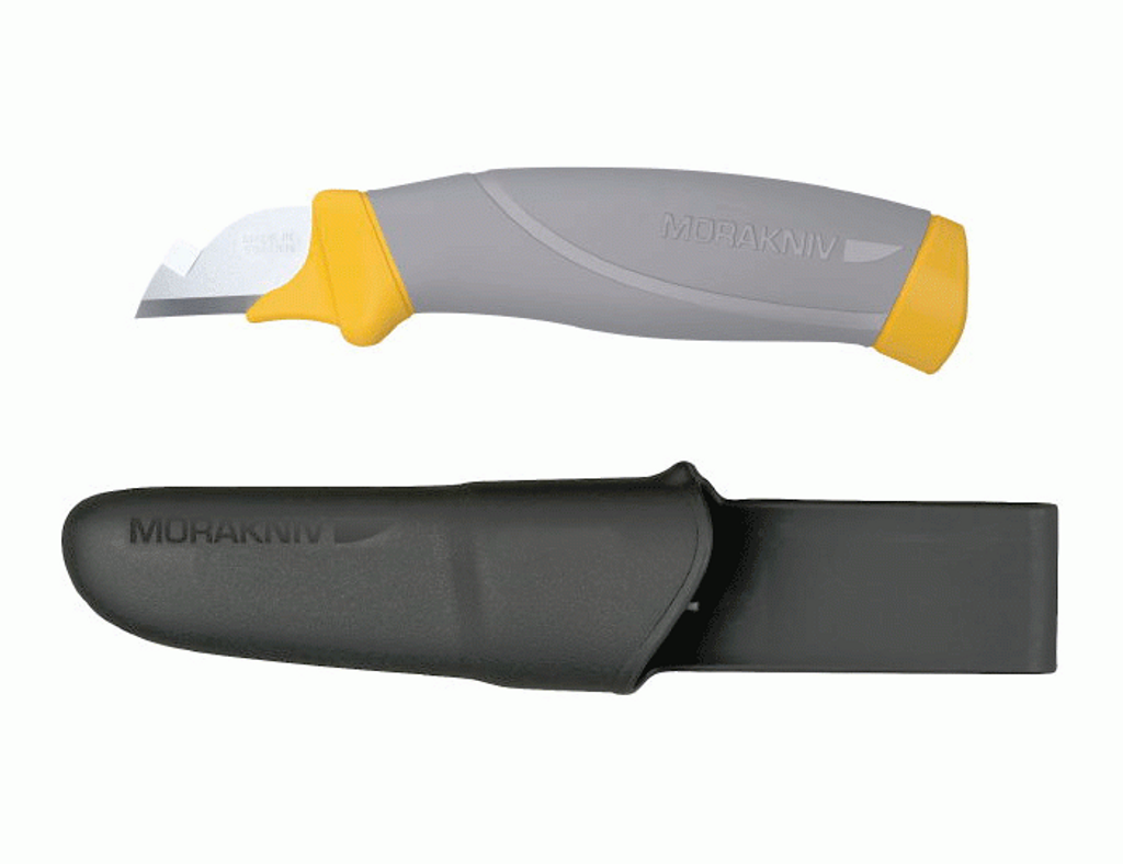 Mora Montör/Elkniv med en speciell funktion för kabelskalning. Ett integrerat ergonomiskt fingerskydd på bladet, dubbelgjutet gummigrepp och rostfritt blad. Trygg hantering. Förebygger arbetsskador. Slida av slagtålig plast med enkel fastsättning och avtagning från såväl bälte som knapp.