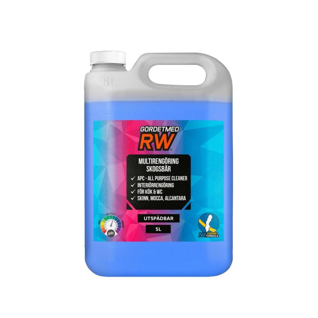Multirengöring Superkoncentrat från Gör Det Med RW med doft av skogsbär är en effektiv allroundrengöring som kan användas koncentrerat eller utspätt. Rekommenderad spädning 20–30% och maximal utspädning 10% rengöring med 90% vatten. Skonsam mot tyg, plast och läder och lämnar inga rester. Perfekt för interiör och motorutrymmen. 5 l.