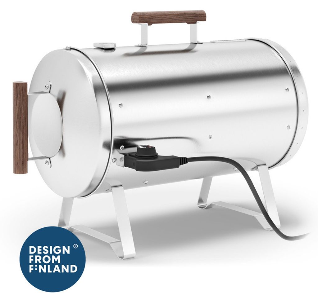 Rymlig och lättanvänd elektrisk rökugn i rostfritt stål med justerbar temperatur 80–220 °C och tydlig termometer för exakt kontroll. Två galler ger plats för fisk, kött, fågel, ost och grönsaker. Avtagbart lock som kan hängas på handtaget, djup droppbricka och sidomonterad avtagbar termostat. Ventil släpper ut överflödig fukt och rök. Handtag i FSC-märkt rökt ask.