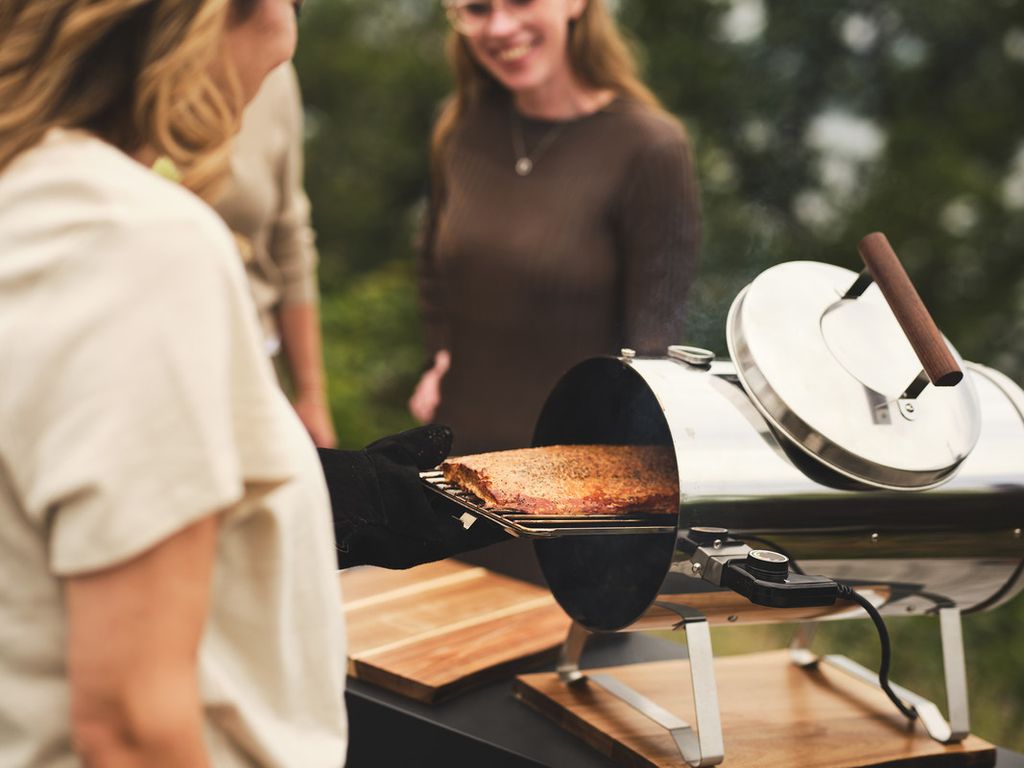 Användarvänligheten sitter i detaljerna. Det avtagbara locket kan bekvämt hängas på handtaget när maten ska tas ut, och en djup droppbricka fångar upp fett och vätska för renare rökning och mindre efterarbete. Den sidomonterade termostaten är avtagbar för smidig förvaring och enkel hantering. En smart ventil i locket hjälper till att släppa ut överflödig fukt och rök för jämnare cirkulation.