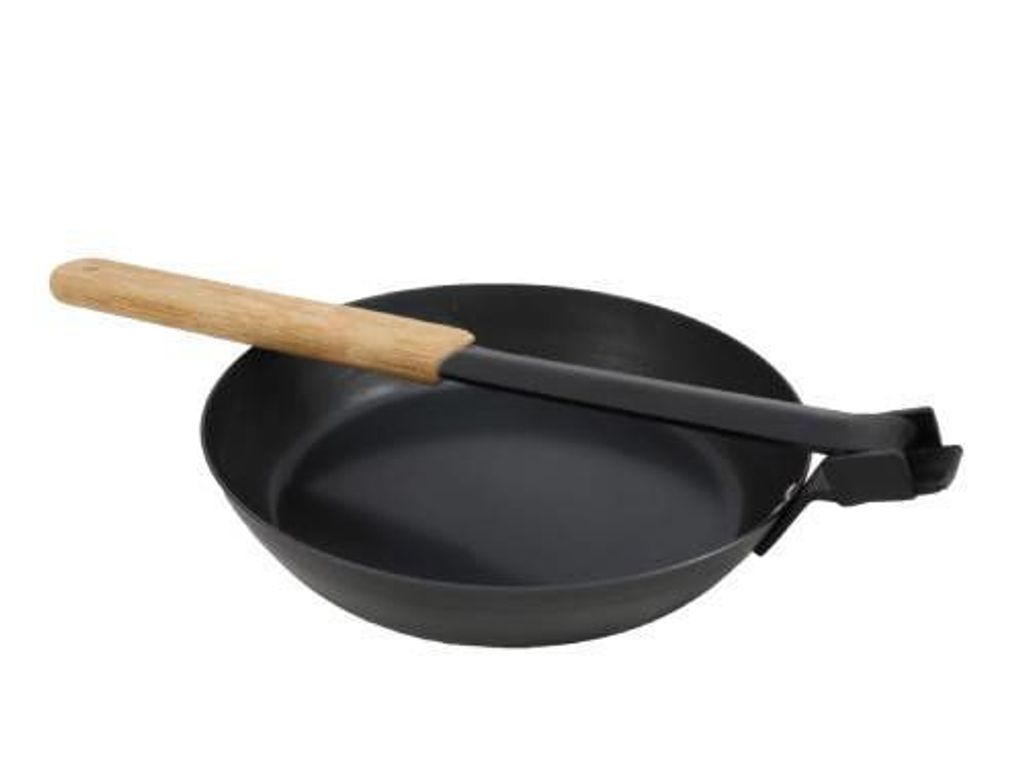 Jägarstekpanna i kolstål av hög kvalitet med hopfällbart handtag.